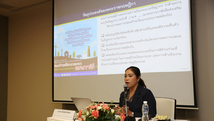 The seminar also invited other 2 distinguish speakers to cooperatively join and share their experiences and perspectives on tax measure in regards to climate solutions; (1) Mr. Nutthakorn Utensute, Director of Planning Bureau, the Excise Department, reflected excise tax measures based on carbon dioxide mission for vehicles. And (2) Dr. Kanchit Kunakorn, Director of Tax Innovation Department, Bureau of Tax Policy, the Fiscal Policy Office showed his vision and perception on biodegradable plastic-supportive tax measures. Other major issues exhibited in the event were tax incentives for carbon credit sellers under Thailand Voluntary Emission Reduction Program (T-VER) and Low Emission Support Scheme (LESS) projects in Thailand. The issues also covers related rules for tax exemptions after credits were sold and verified by TGO. The seminar beneficially provided significant perspectives of various experts as well as crucial policy makers which could eligibly leads to further enhancement on domestic greenhouse gas emission reduction project developers in order to heighten their activities and support the national mitigation target.