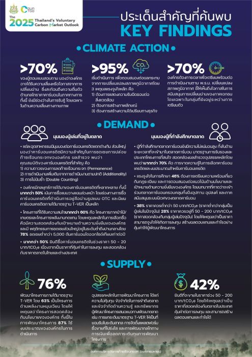 ในภาพรวม ผู้ประกอบการส่วนใหญ่ตระหนักถึงการเปลี่ยนผ่าน โดยกว่า 70% มองว่าการเปลี่ยนแปลงด้านสภาพภูมิอากาศจะส่งผลกระทบต่อธุรกิจทั้งในแง่ของความเสี่ยงและโอกาส และมากกว่า 95% ได้เริ่มดำเนินการเพื่อรับมือกับผลกระทบแล้ว โดยมี 3 แรงจูงใจหลักคือ 1) ความต้องการแสดงความรับผิดชอบต่อสิ่งแวดล้อม 2) การสร้างภาพลักษณ์องค์กร และ 3) การสร้างความได้เปรียบทางธุรกิจ อย่างไรก็ตาม องค์กรกว่า 70% ยังต้องการเวลาเพื่อเตรียมพร้อม สำหรับการดำเนินการตาม พ.ร.บ. การเปลี่ยนแปลงสภาพภูมิอากาศที่กำลังจะมาถึง ซึ่งชี้ให้เห็นถึงความจำเป็นในการสนับสนุนและให้ความรู้แก่ภาคเอกชนอย่างต่อเนื่อง ซึ่งผู้ซื้อส่วนใหญ่มีพฤติกรรมรอดูสถานการณ์ (Wait and See) โดยเฉพาะภาคเอกชนไม่มีแรงจูงใจที่ชัดเจนหรือเพียงพอในการเข้าซื้อคาร์บอนเครดิตอย่างต่อเนื่อง ทั้งจากมิติของแรงผลักดันทางกฎหมาย สิทธิประโยชน์ทางภาษี หรือแรงจูงใจจากภาคการเงินและการลงทุนทำให้ความต้องการขยายตัวอย่างจำกัด