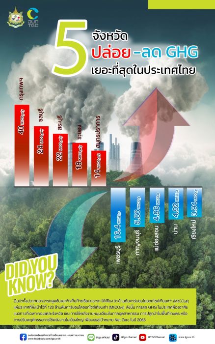 จากรายงานสรุปผลข้อมูลการปล่อยก๊าซเรือนกระจกของ 77 จังหวัด พบว่ามี 5 จังหวัดที่ปล่อยก๊าซเรือนกระจกมากที่สุดในประเทศไทย และมี 5 จังหวัดที่มีการปล่อยก๊าซเรือนกระจกน้อยที่สุดหรือบรรลุ Net Zero แล้ว ได้แก่